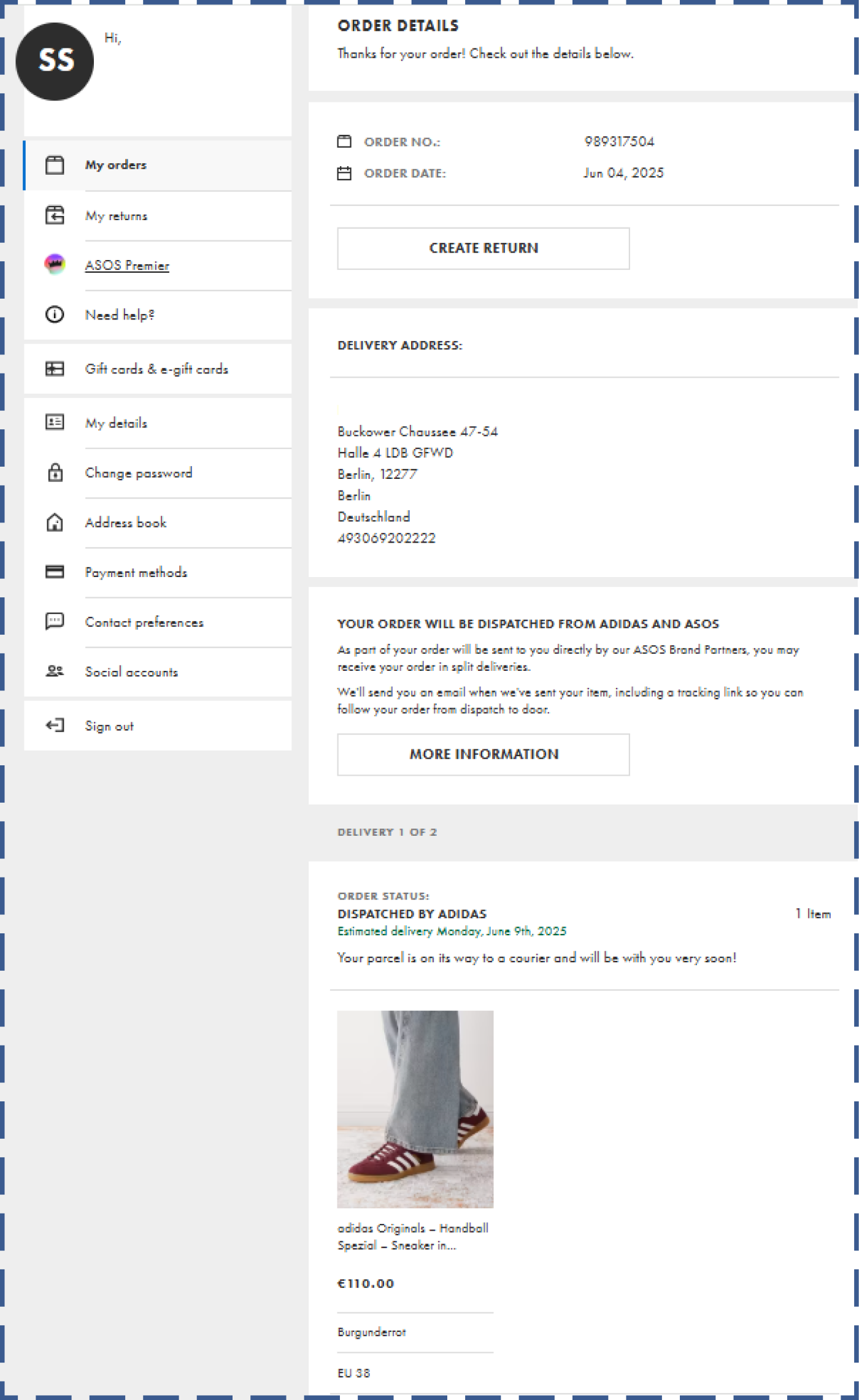 8. Для корректного декларирования по прибытию посылки на склад загрузите инвойс в личном кабинете. В качестве инвойса подойдёт и скриншот заказа из личного кабинета ASOS. Для этого перейдите в свой профиль в раздел «My Orders» и нажмите «Order Details». Сделайте скриншот списка товаров с наименованием каждой позиции и ценой и прикрепите к декларации.