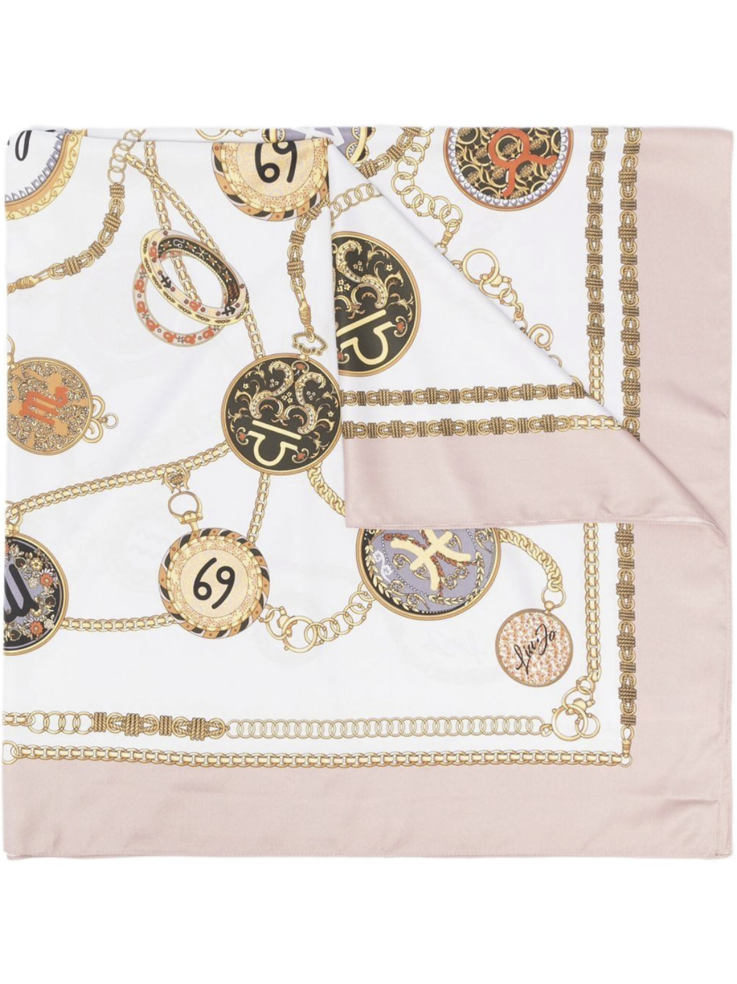 Обязательной деталью к образу мы рекомендуем шарф с графичным принтом LIU JO. Его можно заказать на американском Farfetch за 3 293 рубля и носить как бандану.