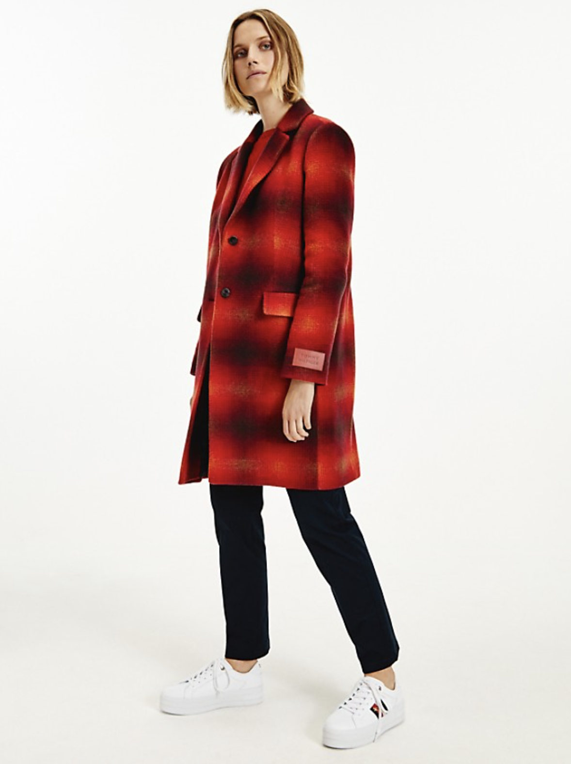 Задает тональность аутфиту классическое пальто в клетку бойкого красного цвета от Tommy Hilfiger. Продается сейчас на сайте бренда в США со скидкой всего за 12 545 рублей!